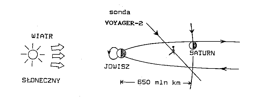 Figure. 1. The long tail of the Jovian magnetosphere: Configuration of planets when Voyager 2 approached Saturn in 1981 (W. Macek, Long Magnetic Tails in the Solar System, 1987, habilitation thesis).