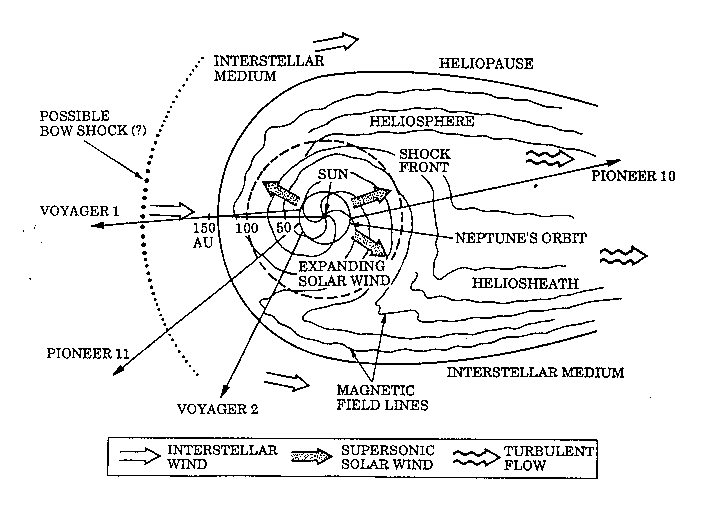 Figure. 2. The interaction of the solar wind the very local interstellar medium. Shown are the boundaries of the heliosphere: inner shock front, heliopause, and outer bow shock. The heliopause is at the outermost extent of the solar wind. Beyond the heliopause lies the interstellar wind, this sketch is taken from The Voyager Neptune Travel Guide, JPL Publication 89-24.