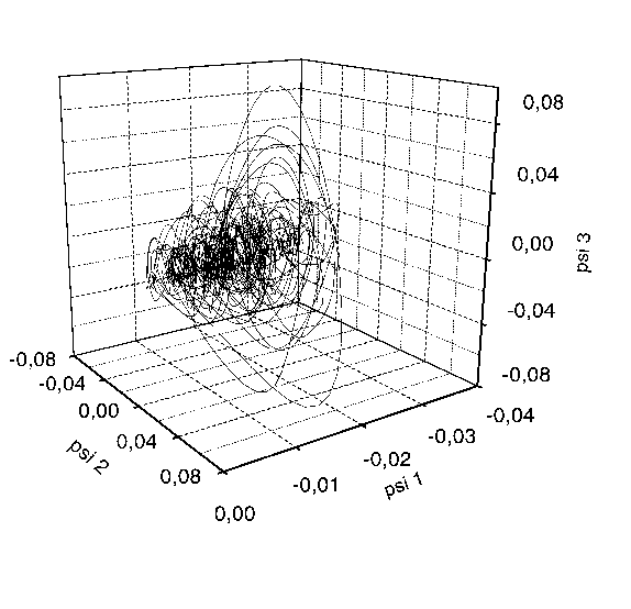 Figure. 3. The projection of the attractor onto the three-dimensional space, reconstructed from the Helios solar wind data, using the moving average and the singular-value decomposition filters [W. M. Macek, 1998, Fig. 5 b].
